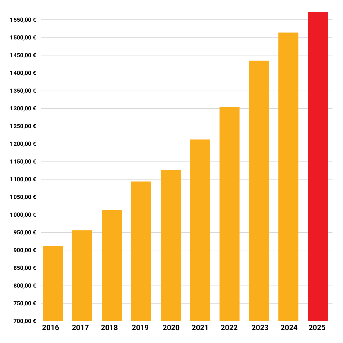 Graf priemernej mzdy od roku 2016 v EUR